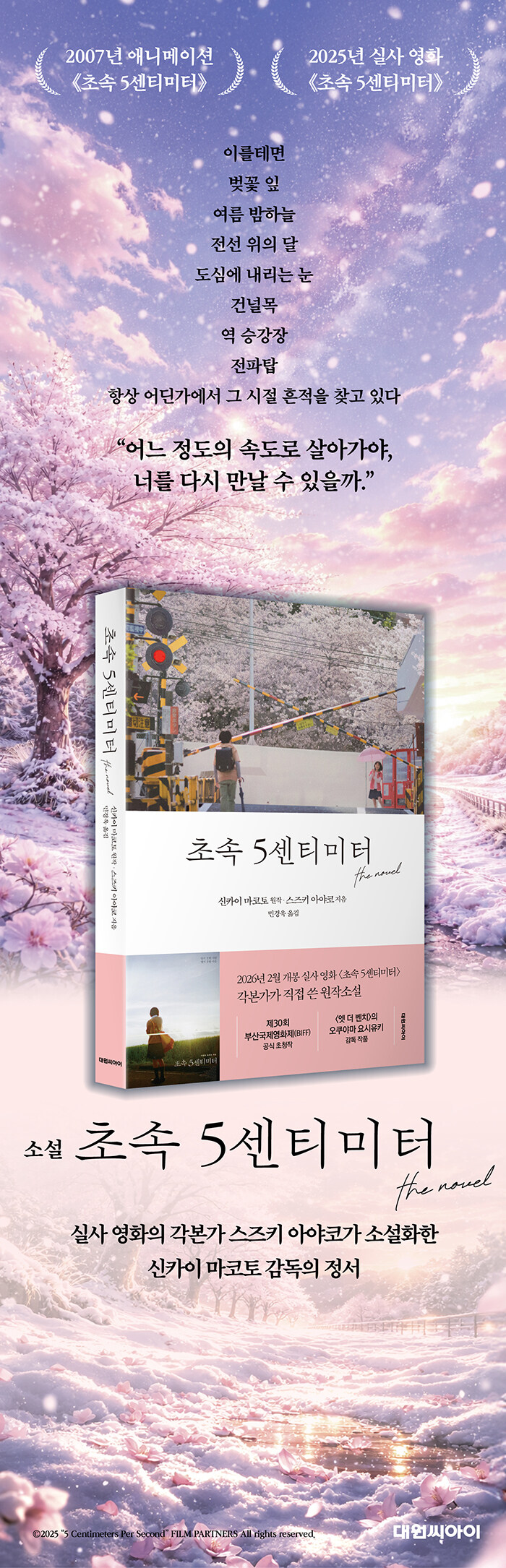 The animated film 5 Centimeters per Second, directed by Makoto Shinkai and released in 2007, is being adapted into a live-action film set to premiere in Korea in February 2026. While the original animated version had a runtime of 63 minutes, this new film runs for 122 minutes—offering twice the length, and with it, twice the story and emotion. Even so, it shares the same sensibility as the original work.