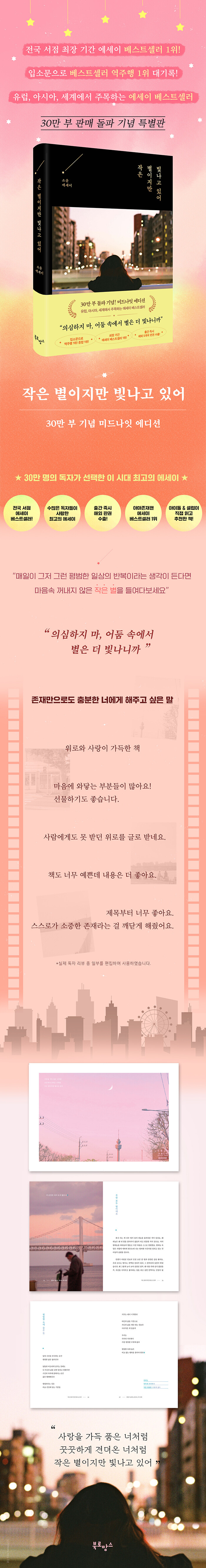 2021년 에세이 분야 최장기 베스트셀러에 오른 『작은 별이지만 빛나고 있어』가 30만 부 판매를 기념해 더욱 깊어진 감성으로 ‘미드나잇 에디션’을 선보인다. 도시의 밤을 담은 은은한 사진과 고요한 블랙 컬러로 구성된 이번 스페셜 리커버는, 각자의 자리에서 묵묵히 하루를 견디며 살아가는 우리 모두를 위한 작고 단단한 격려다. 이 책이 긴 시간 독자들의 마음을 움직이며 역주행 베스트셀러가 될 수 있었던 이유는, 거창하고 화려하지 않아도 충분히 아름다운 각자의 삶을 있는 그대로 바라봐주는 다정한 시선 덕분이다. 평범해 보이는 하루하루 속에도 분명 반짝이는 순간들이 있다는 사실을, 그리고 때로는 멈추어 숨을 고르더라도 천천히 길을 걷고 있는 당신은 충분히 잘하고 있다는 사실을, 이 책은 진심 어린 문장으로 차곡차곡 담아내며 많은 독자들의 마음을 울린다. “여러 개의 나쁜 일 뒤에 한 개의 기쁜 일이 나를 살게 하니까. 살다 보면 더 작은 기쁨이 때로 나를 온전히 위로하니까.” 오늘도 묵묵히 하루를 살아낸 우리에게 꼭 필요한 위로와 응원을 선물해 주면 어떨까. 오래도록 잔잔한 울림을 남기는 문장들이 우리 곁에서 든든한 버팀목이 되어 줄 것이다.
