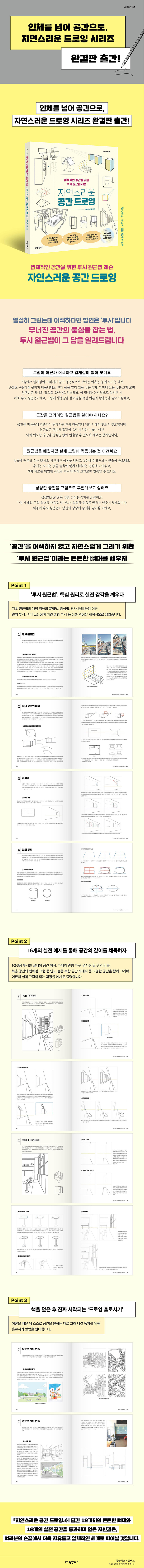 이론 학습 이후에도 혼자 그릴 수 있도록 관찰 훈련과 손 연습 방법을 안내한다. 공간을 보는 눈을 기르고 종이 위에 깊이감을 구현하는 과정까지 담아, 입문자가 실제 드로잉으로 확장할 수 있는 출간의 의미를 분명히 한다.