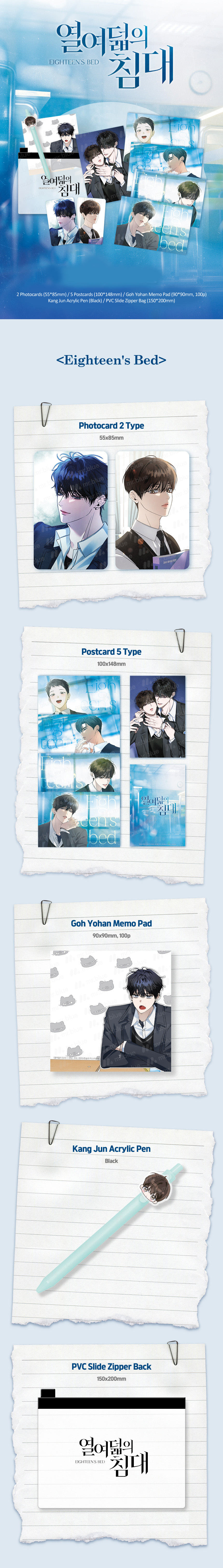 2 Photocards, 5 Postcards, 1 Memo Pad, 1 Kang Jun Acrylic Pen, 1 PVC Slide Zipper Bag