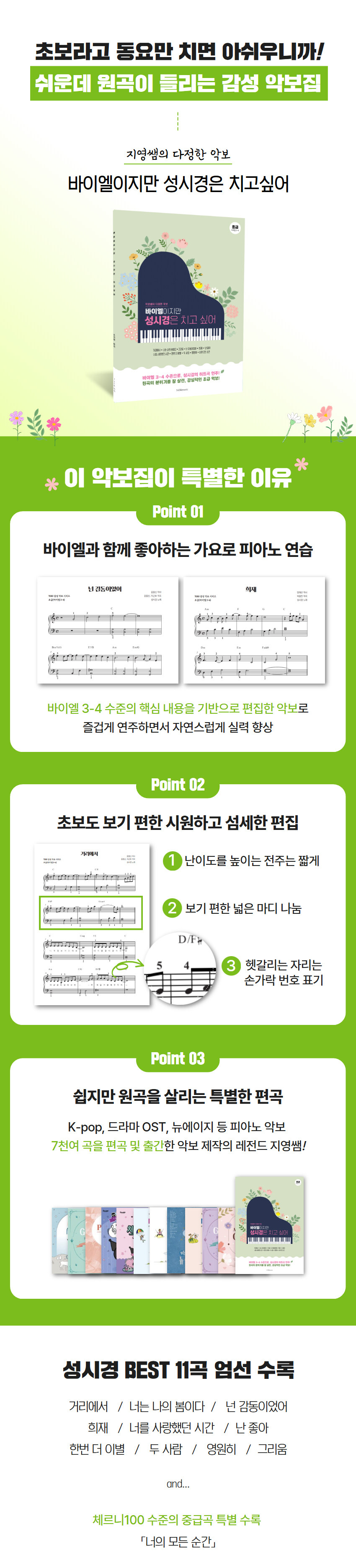 난이도를 높이는 전주는 짧게 줄이고, 마디는 넓게 배치했으며, 헷갈리는 자리마다 손가락 번호를 표기해 두었다. 여기에 난이도를 상승시키는 브릿지나 전조 구간 등을 과감하게 생략하여, ‘진짜 초보자’를 위한 ‘진짜 쉬운’ 악보집을 만들었다. 대중에게 가장 사랑받는 성시경의 히트곡 11곡을 엄선했다. 원곡의 감성이 고스란히 느껴지는 섬세한 편곡을 경험해 보자.