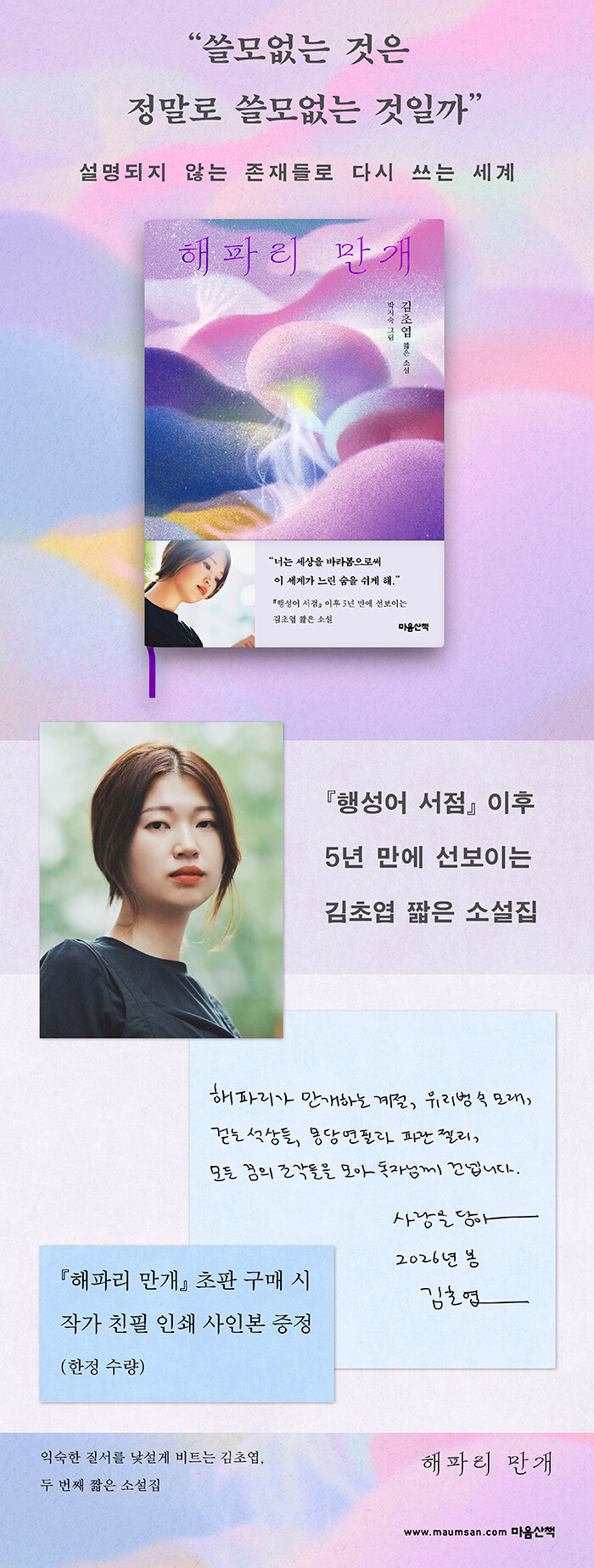 인간과 비인간이 교차하는 세계를 탐구해온 김초엽의 두 번째 짧은 소설집 『해파리 만개』는, 규정할 수 없는 존재들과의 만남을 통해 우리가 세계를 이해하고 구분해온 방식을 되묻는다. 전작이 낯선 세계의 문을 열었다면, 이번 작품은 한층 더 나아가 인간 중심의 인식 틀을 흔들며 새로운 감각을 제안한다. 모래, 해파리, 끈적이, 네모, 젤리, 골렘 등 기존 질서에 포섭되지 않는 존재들은 인간의 기준과 효율성을 무너뜨리며 공존의 가능성을 질문한다. 여기에 박지숙 작가의 그림이 더해져, 현실과 비현실의 경계를 넘나드는 이야기를 시각적으로 확장하며 작품의 감각을 더욱 풍부하게 만든다.