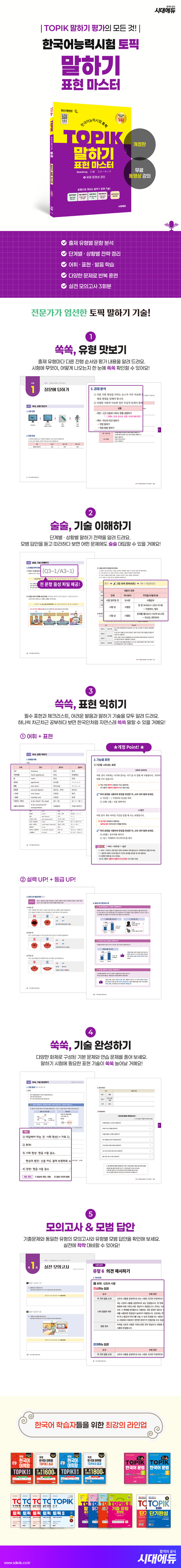 ▶ TOPIK 말하기 평가, 쉽고 빠르게 준비하자! [쏙쏙! 유형 맛보기] 난이도, 출제 경향, 평가 기준 등 출제 유형별 특징을 알아보세요. [술술! 기술 이해하기] 대표 문제를 통해 단계별 · 상황별 말하기 전략을 확인하세요. [쓱쓱! 표현 익히기] 필수 표현, 발음 포인트, 체크리스트로 표현 기술을 정리하세요. [쑥쑥! 기술 완성하기] 문제를 풀면서 앞에서 배운 말하기 기술을 내 것으로 만드세요.