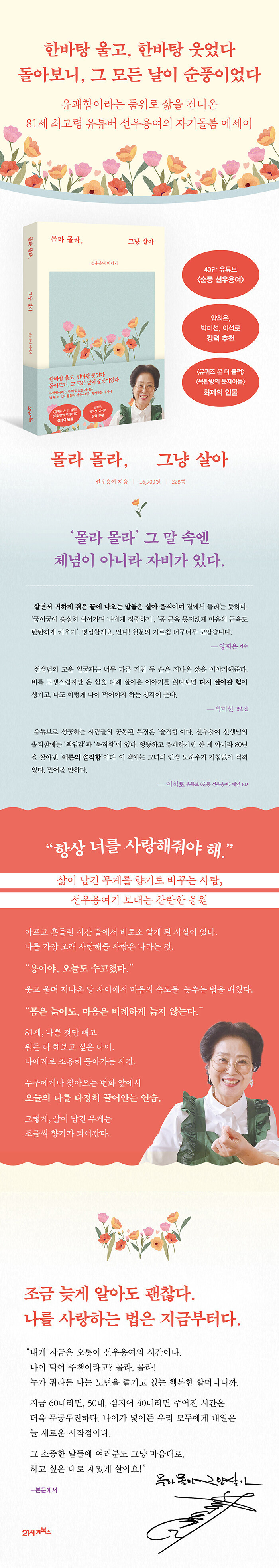 에세이 시장에서 이 책의 강점은 두 가지 지점에서 분명해진다. 하나는 ‘경험의 신뢰도’다. 대중이 기억하는 ‘순풍의 용여 선생님’이자 지금도 스스로의 일상을 기록하고 공유하는 현역의 시간, 바로 그 축적이 문장을 떠받친다. 다른 하나는 ‘실천 가능성’이다. 이 책은 조언을 늘어놓기보다 하루의 루틴과 손에 잡히는 장면들로 독자를 설득한다. 백담사를 향한 갑작스러운 나들이, 우동 한 그릇을 위해 비행기를 타는 소소한 여행, 몸이 굳어갈수록 더 자주 몸을 일으켜 움직이려는 결심 같은 것들. 그 결과 독자들에겐 ‘잘 살아야 한다’는 막연한 압박 대신 ‘오늘 하루를 잘 돌보는 구체적 방법’을 자연스럽게 안내한다.