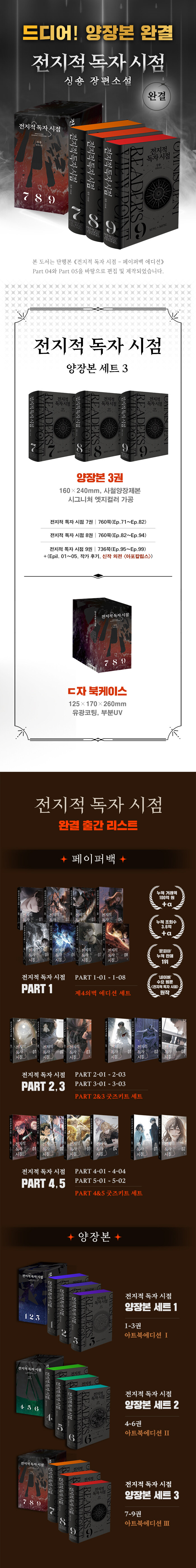한국 웹소설이 남긴 가장 거대한 족적, 끝없는 현재 진행형 레전드 《전지적 독자 시점》. 김영사의 문학 브랜드 비채에서는 《전지적 독자 시점》의 페이퍼백 에디션(Part 1~5)을 20권으로 완결하였고, 양장본과 굿즈세트가 포함된 아트북에디션을 2022년부터 출간해왔다. 2025년, 드디어 《전지적 독자 시점》 공식 양장본이 그랜드 피날레를 맞이한다.