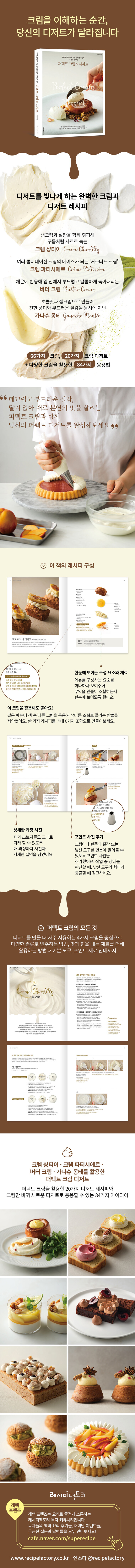 1장 ‘퍼펙트 크림의 모든 것’에서는 네 가지 크림의 기본과 변주 레시피 66가지를 소개하고, 이어 20가지 크림 디저트 레시피와 84가지 베리에이션 아이디어를 제안한다. 홈베이커부터 전문 셰프까지, 새로운 제품 개발 없이도 차별화된 디저트를 완성할 수 있도록 돕는 실전 가이드다.
