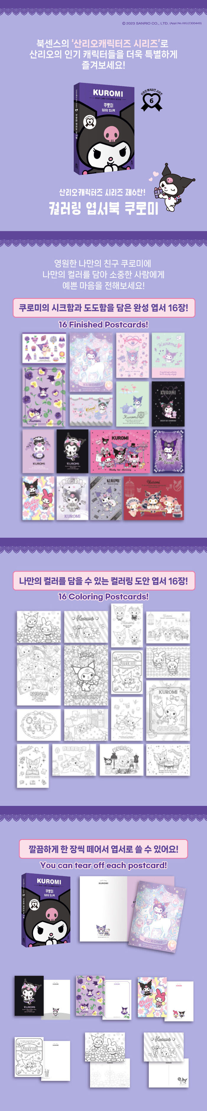 This coloring postcard book contains 16 finished Kuromi postcards, and 16 coloring postcards to add your own colors to Kuromi.